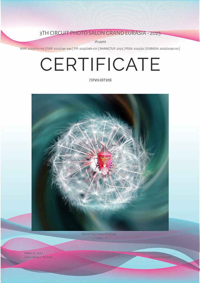 Отметки «Accepted» на конкурсе «3th Circuit Photo Salon Grand Eurasia» в разделе «Open Color» (Индия и Россия, «IAAP 2025/110-113», «FIAP 2025/291-294», «APE 2025/36-39», «FIP 2025/068-071», «PSSA 2025/32», https://ap-eurasia.com/)