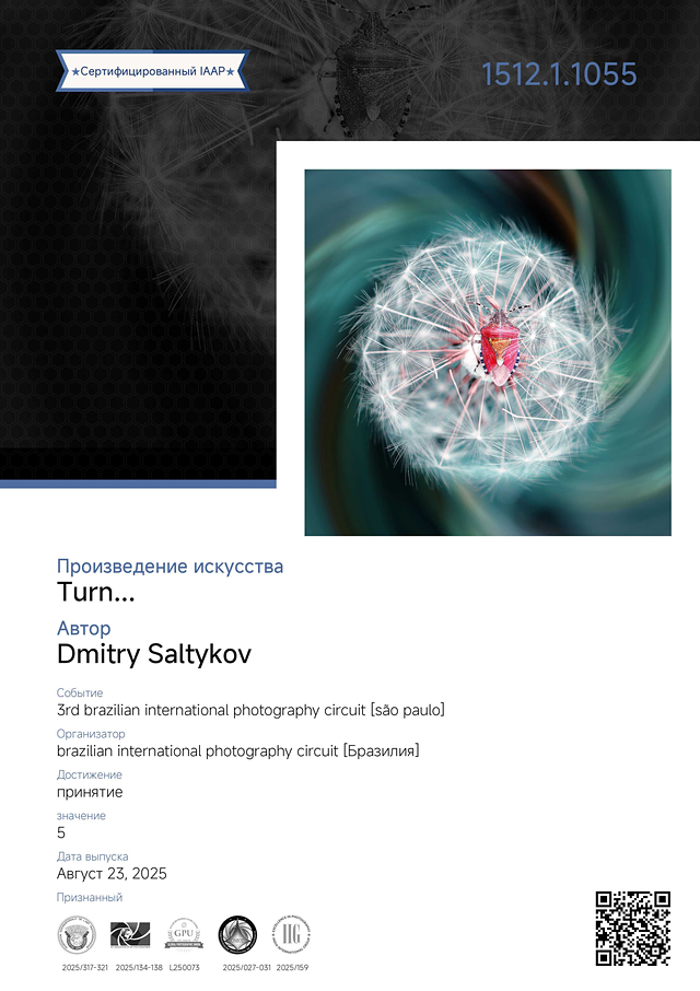 Отметки «Accepted» на конкурсе «3rd Brazilian International Photography Circuit» в разделе «Open Color» (Сан-Паулу и Рибейран-Прету) (Бразилия, «IAAP 2025/134-138», «FIAP 2025/317-321», «GPU L250073», «CONFOTO 2025/027-031», «IIG 2025/159», https://theiaap.com/e/braziliancircuit/)