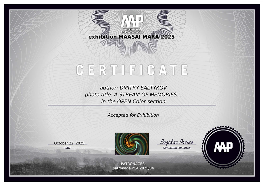 Отметка «Accepted» на конкурсе «AAP Exhibition MAASAI MARA 2025» в разделе «OPEN Color» (Кения, «PCA 2025/34», «AAP», https://aap-photo.com/mm25/)