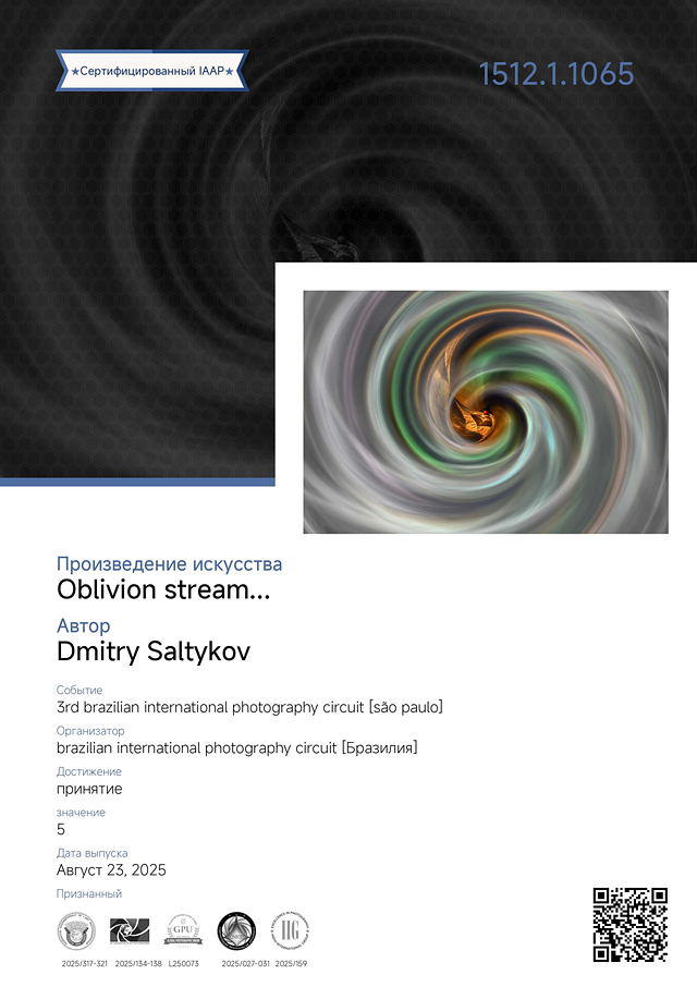 Отметки «Accepted» на конкурсе «3rd Brazilian International Photography Circuit»в разделе «Creative Image» (Сан-Паулу, Рибейран-Прету и Сан-Жозе-ду-Риу-Прету)(Бразилия, «IAAP 2025/134-138», «FIAP 2025/317-321», «GPU L250073»,«CONFOTO 2025/027-031», «IIG 2025/159», https://theiaap.com/e/braziliancircuit/)