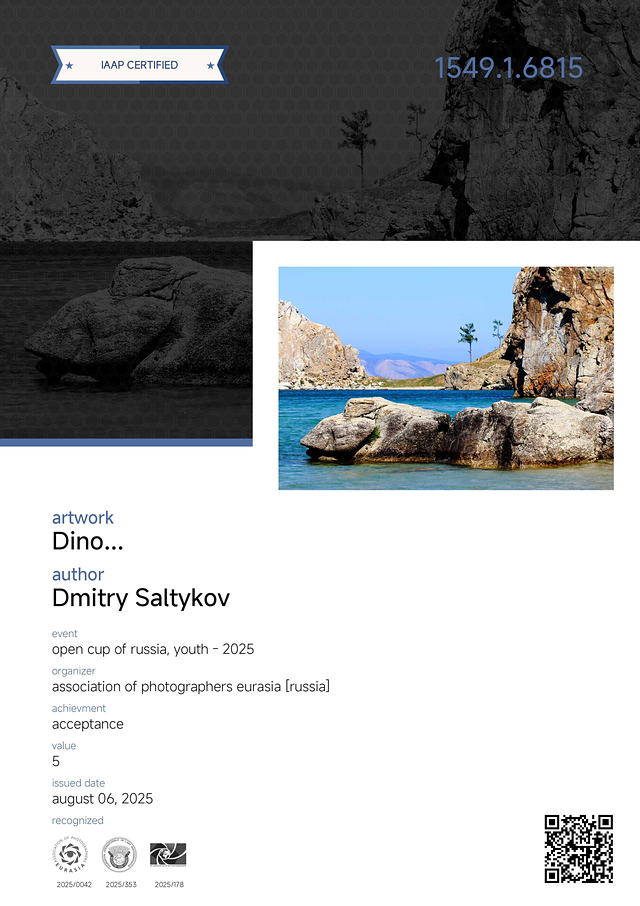 Отметка «Accepted» на конкурсе «Open Cup of Russia, Youth» в разделе «Landscape» (Россия, «IAAP 2025/178», «FIAP 2025/353», «APE 2025/0042», https://russian-cup-youth.com/)