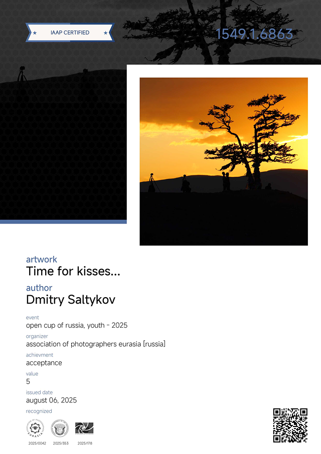 Отметка «Accepted» на конкурсе «Open Cup of Russia, Youth» в разделе «World in Focus» (Россия, «IAAP 2025/178», «FIAP 2025/353», «APE 2025/0042», https://russian-cup-youth.com/)