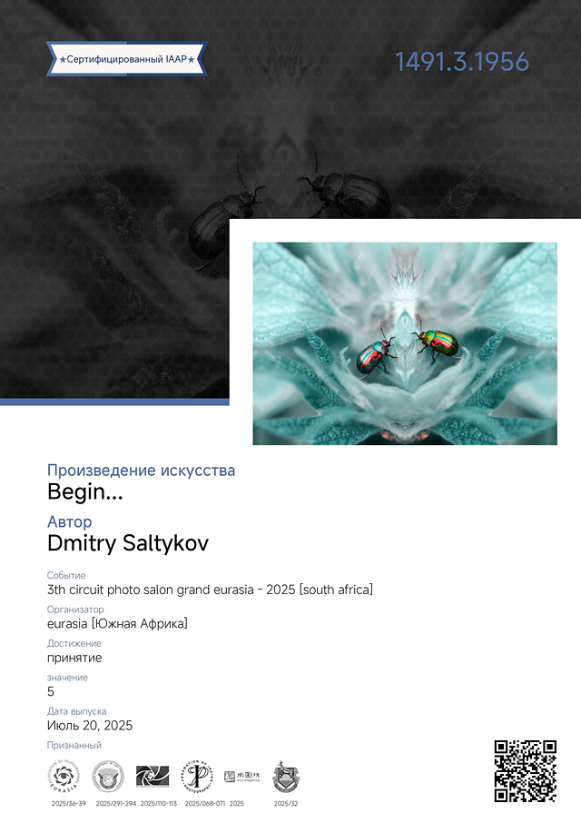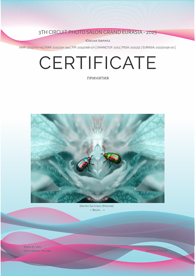 Отметка «Accepted» на конкурсе «3th Circuit Photo Salon Grand Eurasia» в разделе «Open Color» (Россия, «IAAP 2025/110-113», «FIAP 2025/291-294», «APE 2025/36-39», «FIP 2025/068-071», «PSSA 2025/32», https://ap-eurasia.com/)
