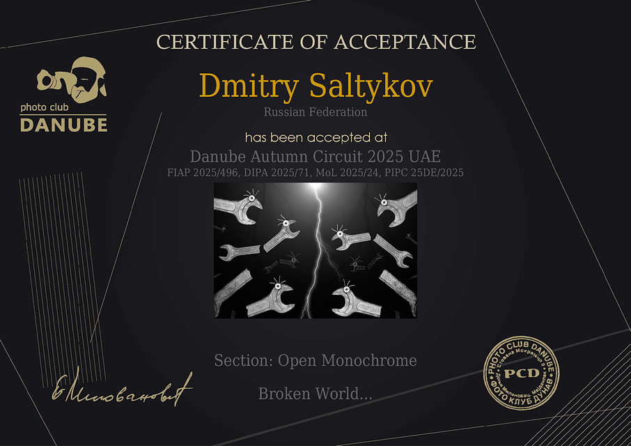 Отметка «Accepted» на конкурсе «Danube Autumn Circuit» в разделе «Open Monochrome» (Катар, «FIAP 2025/496», «DIPA 2025/71», «MoL 2025/24», «PIPC 25DE/2025», «PCD», https://photoclub-danube.com/)