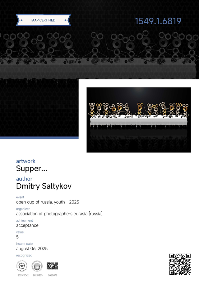 Отметка «Accepted» на конкурсе «Open Cup of Russia, Youth» в разделе «Inanimate Art» (Россия, «IAAP 2025/178», «FIAP 2025/353», «APE 2025/0042», https://russian-cup-youth.com/)