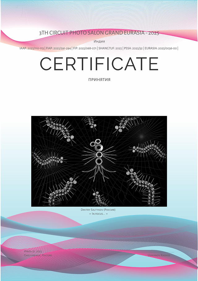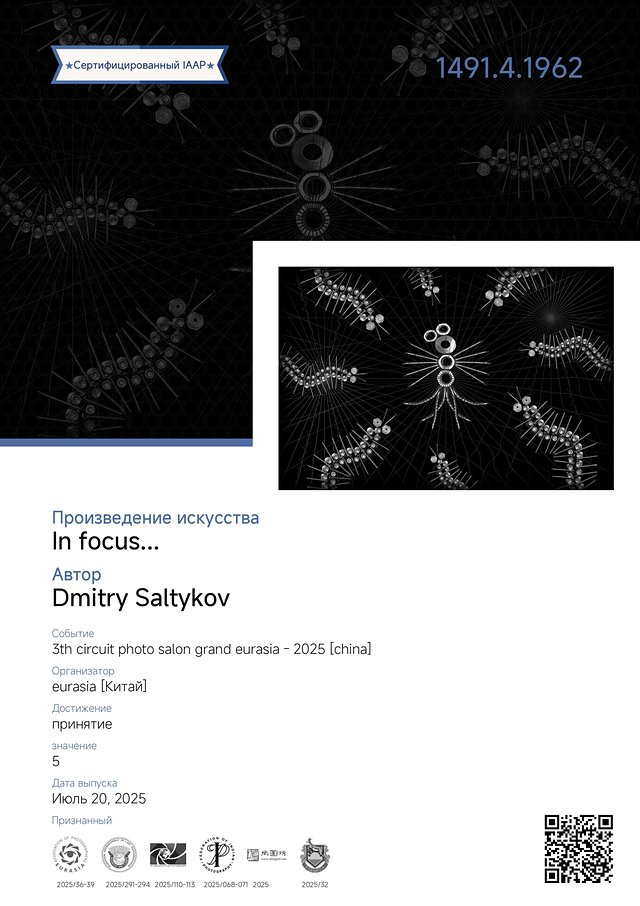 Отметки «Accepted» на конкурсе «3th Circuit Photo Salon Grand Eurasia» в разделе «Open Monochrome» (Китай и Индия, «IAAP 2025/110-113», «FIAP 2025/291-294», «APE 2025/36-39», «FIP 2025/068-071», «PSSA 2025/32», https://ap-eurasia.com/)