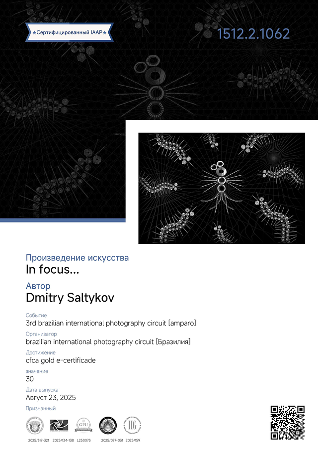 Отметки «Accepted» на конкурсе «3rd Brazilian International Photography Circuit» в разделе «Open Monochrome» (Сан-Паулу и Сан-Жозе-ду-Риу-Прету) (Бразилия, «IAAP 2025/134-138», «FIAP 2025/317-321», «GPU L250073», «CONFOTO 2025/027-031», «IIG 2025/159», https://theiaap.com/e/braziliancircuit/)